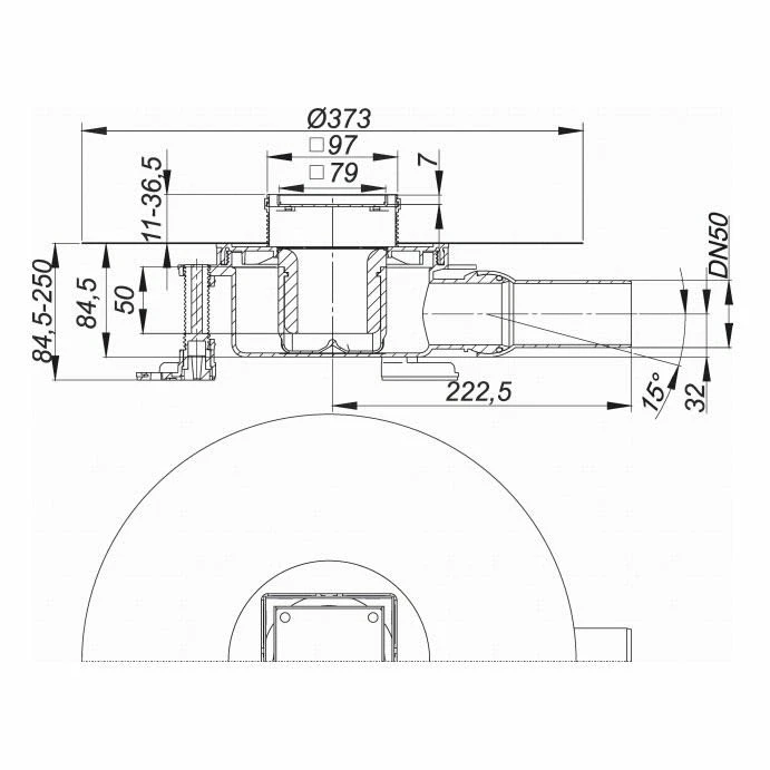 - Ablaufstutzen DN 50 seitlich, mit Kugelgelenk, verstellbar von 0 – 15 Grad
