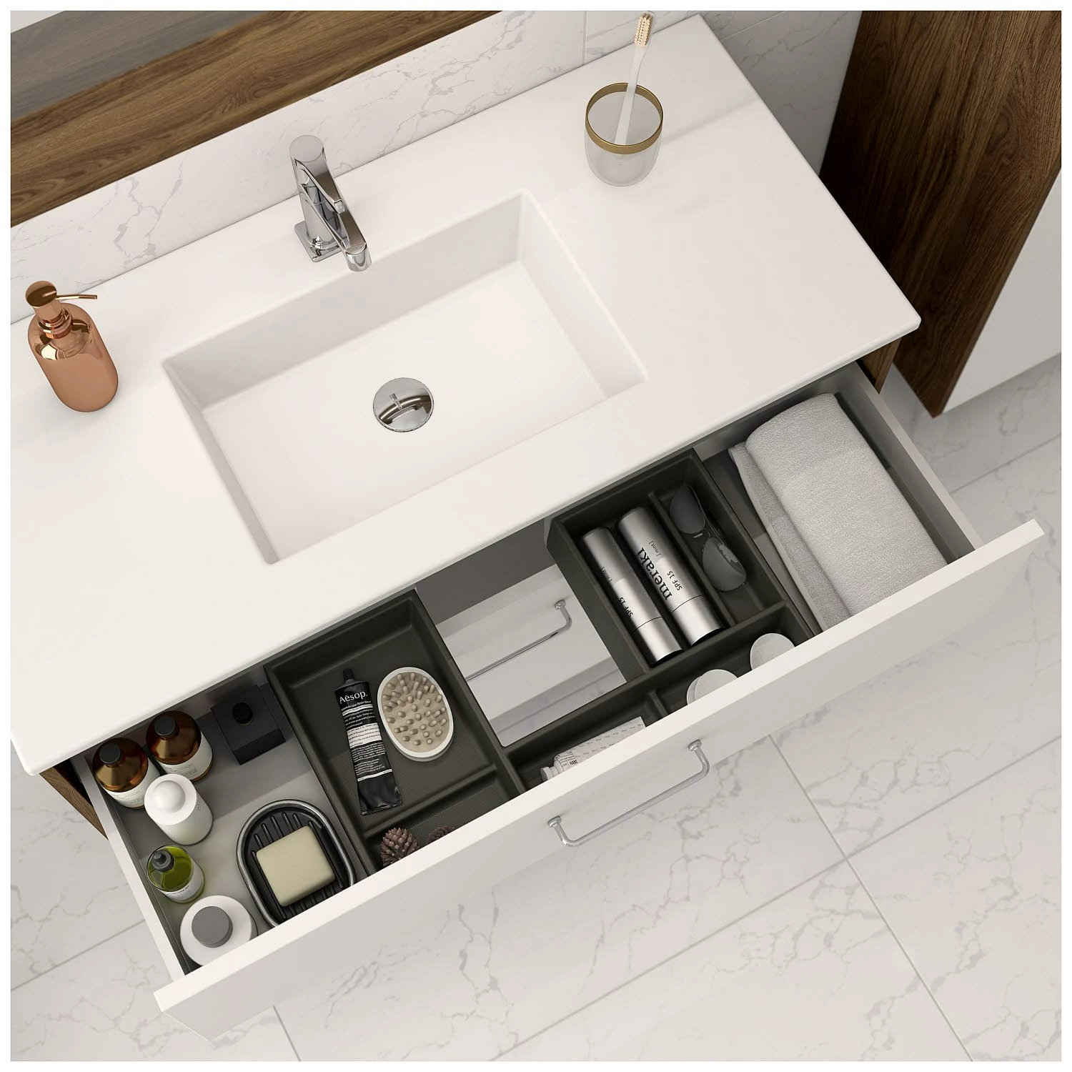 - obere Schublade mit Siphonausschnitt und Raumteiler