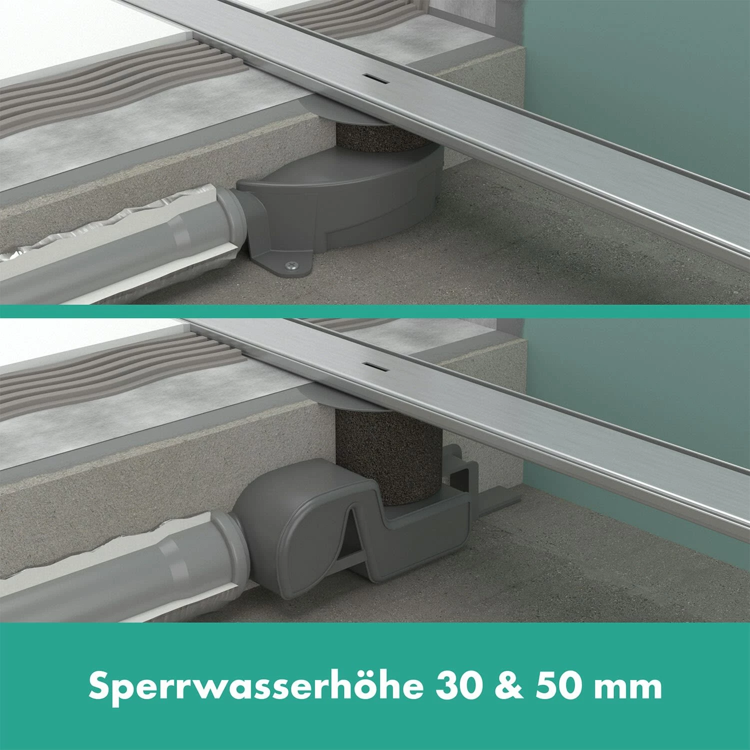 - Flexibel: Für Sperrwasserhöhe 28 mm (flache Installation) oder Sperrwasserhöhe 50 mm (Standard)