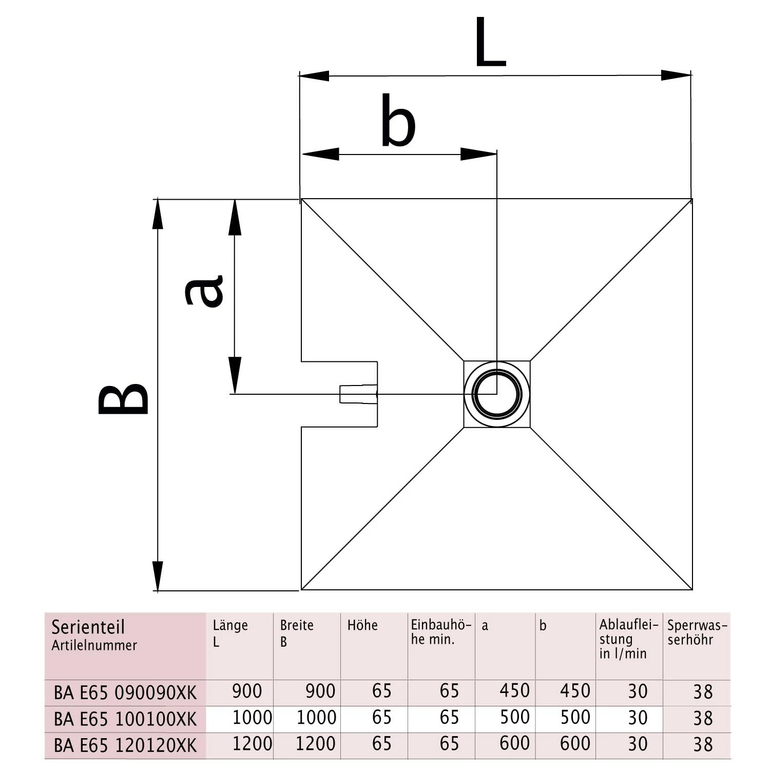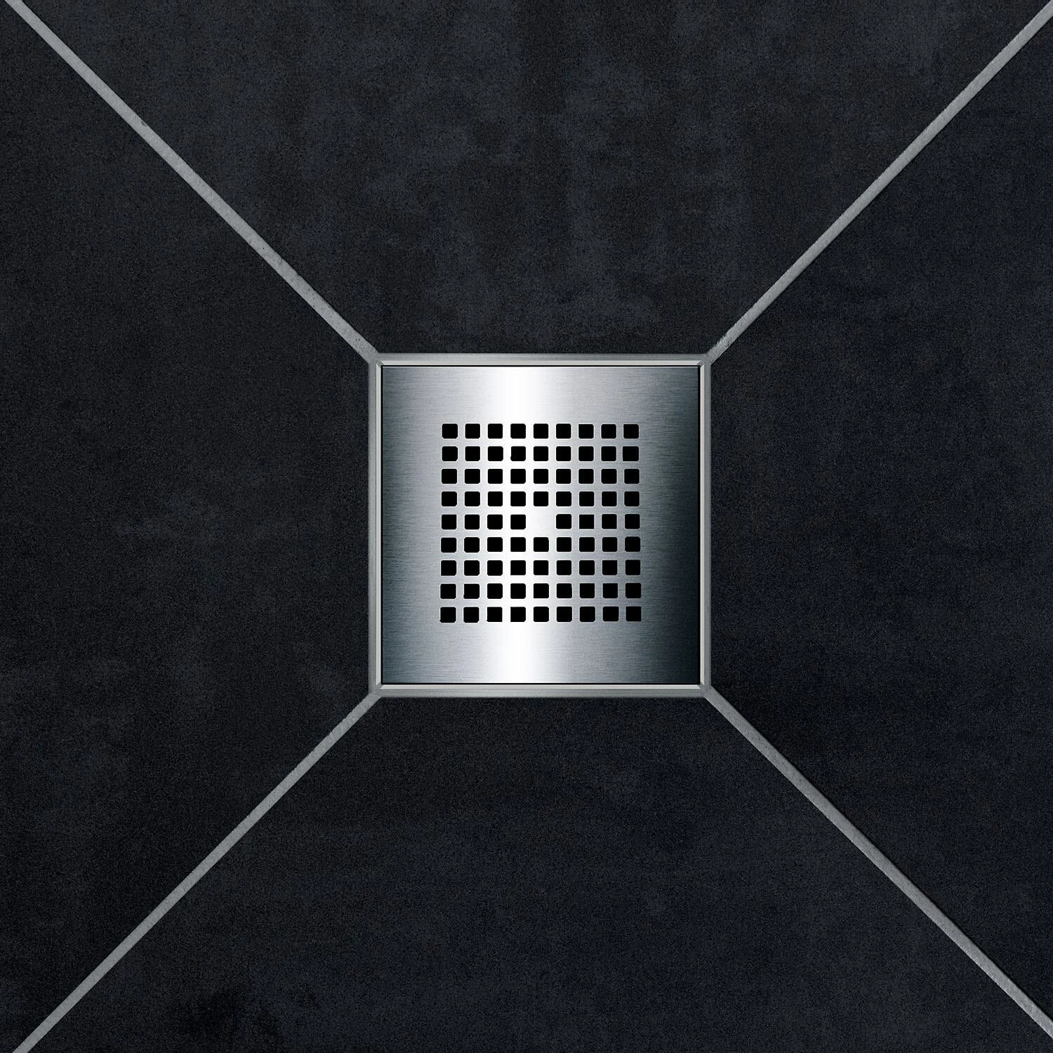 - Serienmäßig mit Ablaufabdeckung aus Edelstahl, Aufstockelement für Aufbauhöhe Fliesenbelag bis 30 mm, Ablaufrahmen (136 mm x 136 mm) aus Kunststoff und Dichtecke 800 x 800 mm
