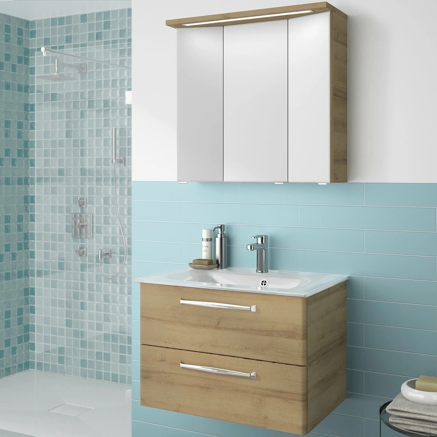 - Waschtisch, Waschtischunterschrank und Spiegelschrank 3D mit LED Leuchte im Kranzboden