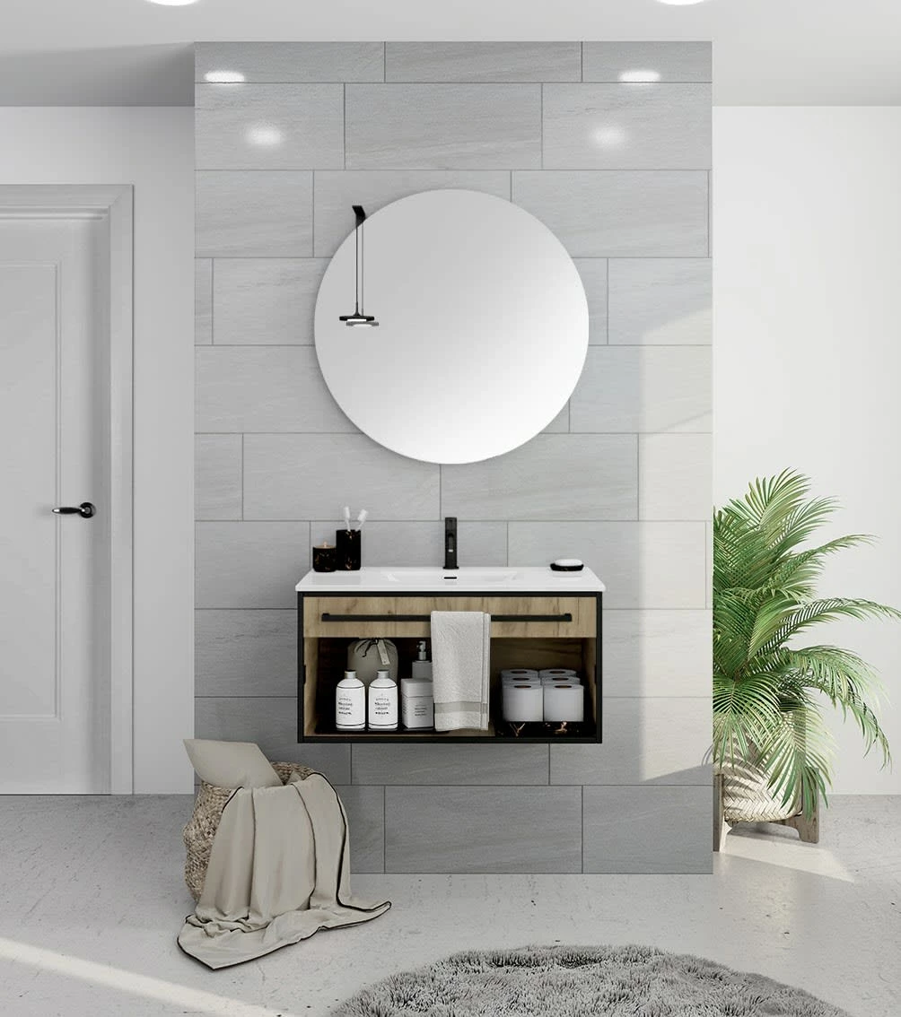 Hinweise: Der Spiegel, die Wandleuchte und die Waschtischkombination aus diesem Set sind auch einzeln in unserem Sortiment erhältlich. Der Waschtisch aus diesem Set ist nur mit Hahnlochbohrung lieferbar.