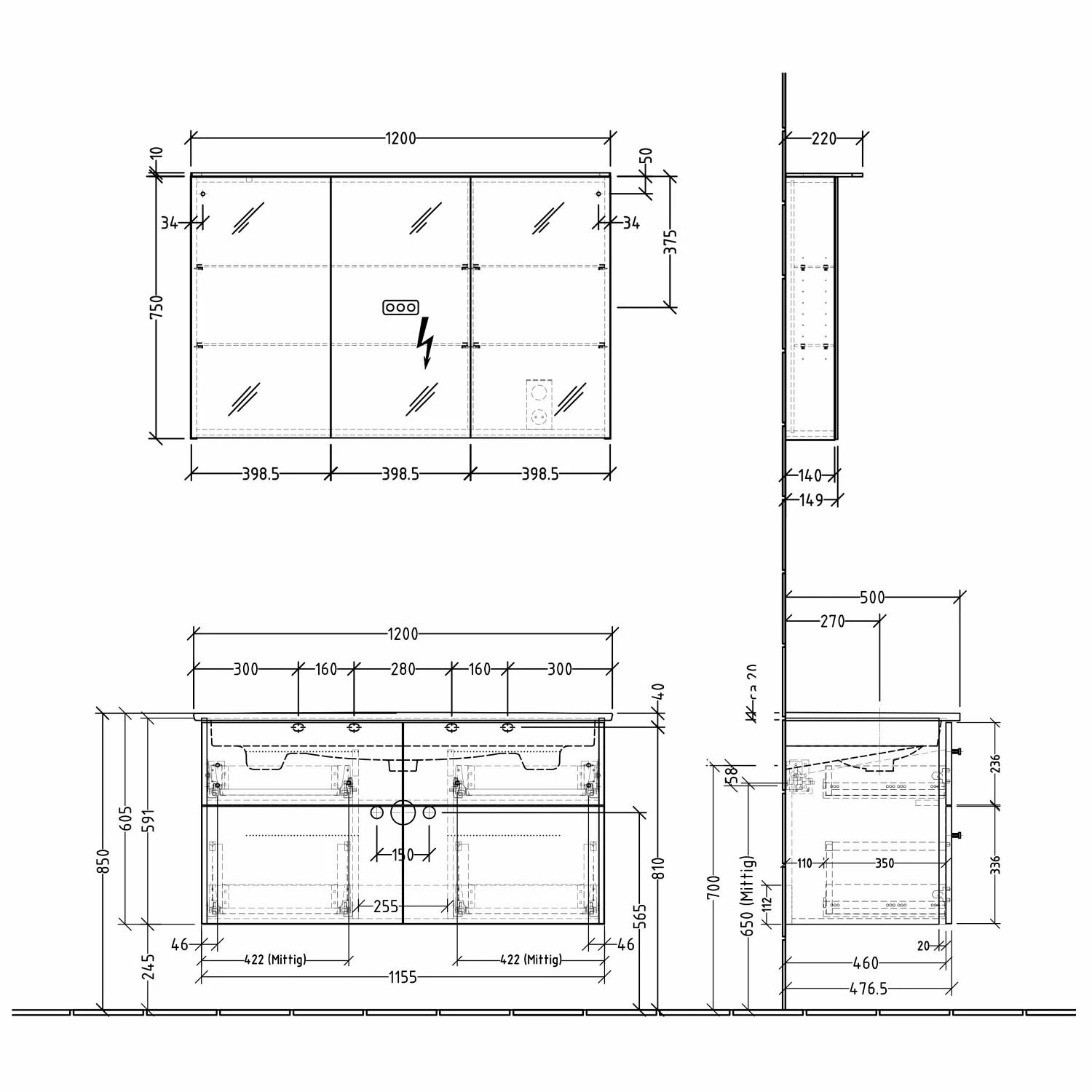 Zum Öffnen der Auszüge planen Sie bitte seitlich links und rechts einen Wandabstand ein!
