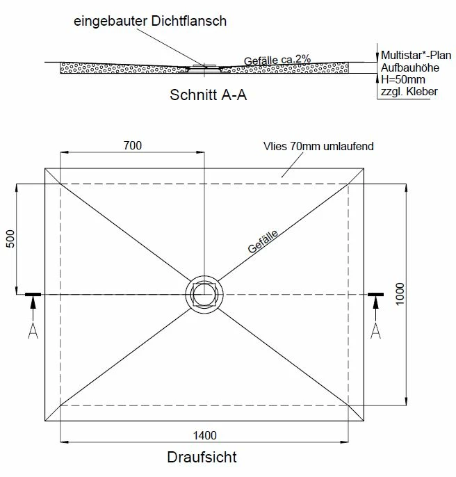 Schedel Plan Duschelement bodeneben 140 x 100 cm, verfliesbar, Ablauf mittig