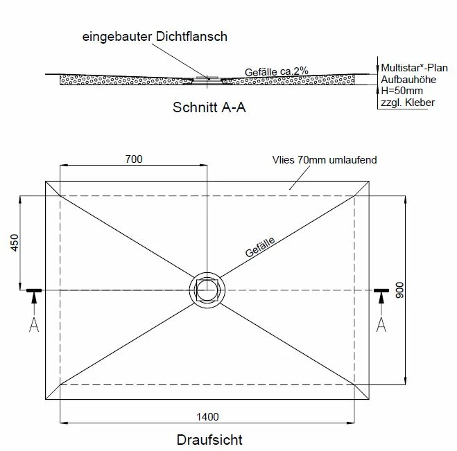 Schedel Plan Duschelement bodeneben 140 x 90 cm, verfliesbar, Ablauf mittig