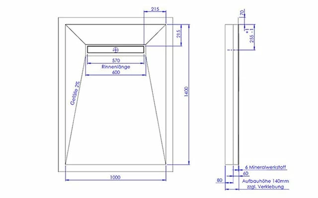 Schedel Plan Plus Mineral-Duschelement bodeneben 100 x 140 cm mit Rinne, Gefälle vierseitig