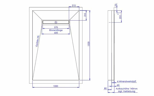 Schedel Plan Plus Mineral-Duschelement bodeneben 100 x 150 cm mit Rinne, Gefälle vierseitig