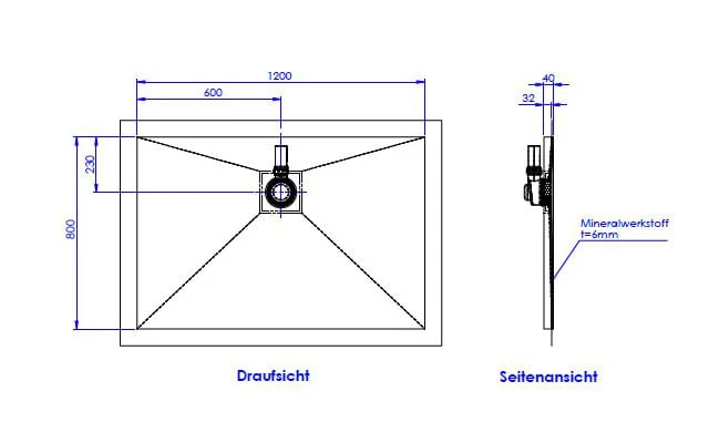 Schedel Plan Plus Mineral-Duschelement bodeneben 120 x 80 cm, Ablauf hinten mittig