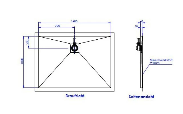 Schedel Plan Plus Mineral-Duschelement bodeneben 140 x 100 cm, Ablauf hinten mittig