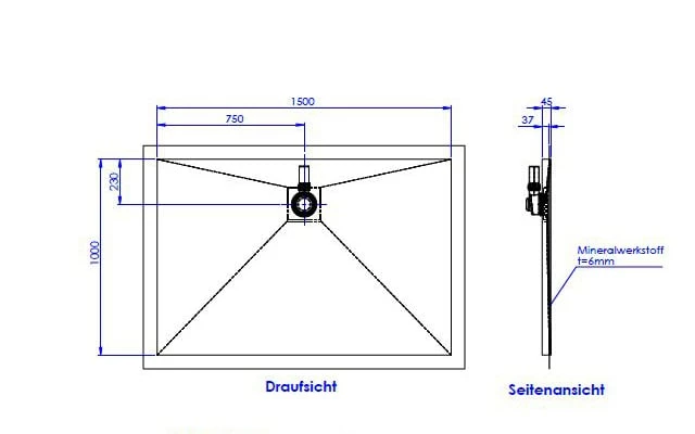 Schedel Plan Plus Mineral-Duschelement bodeneben 150 x 100 cm, Ablauf hinten mittig