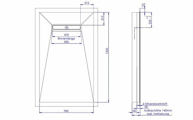 Schedel Plan Plus Mineral-Duschelement bodeneben 90 x 150 cm mit Rinne, Gefälle vierseitig