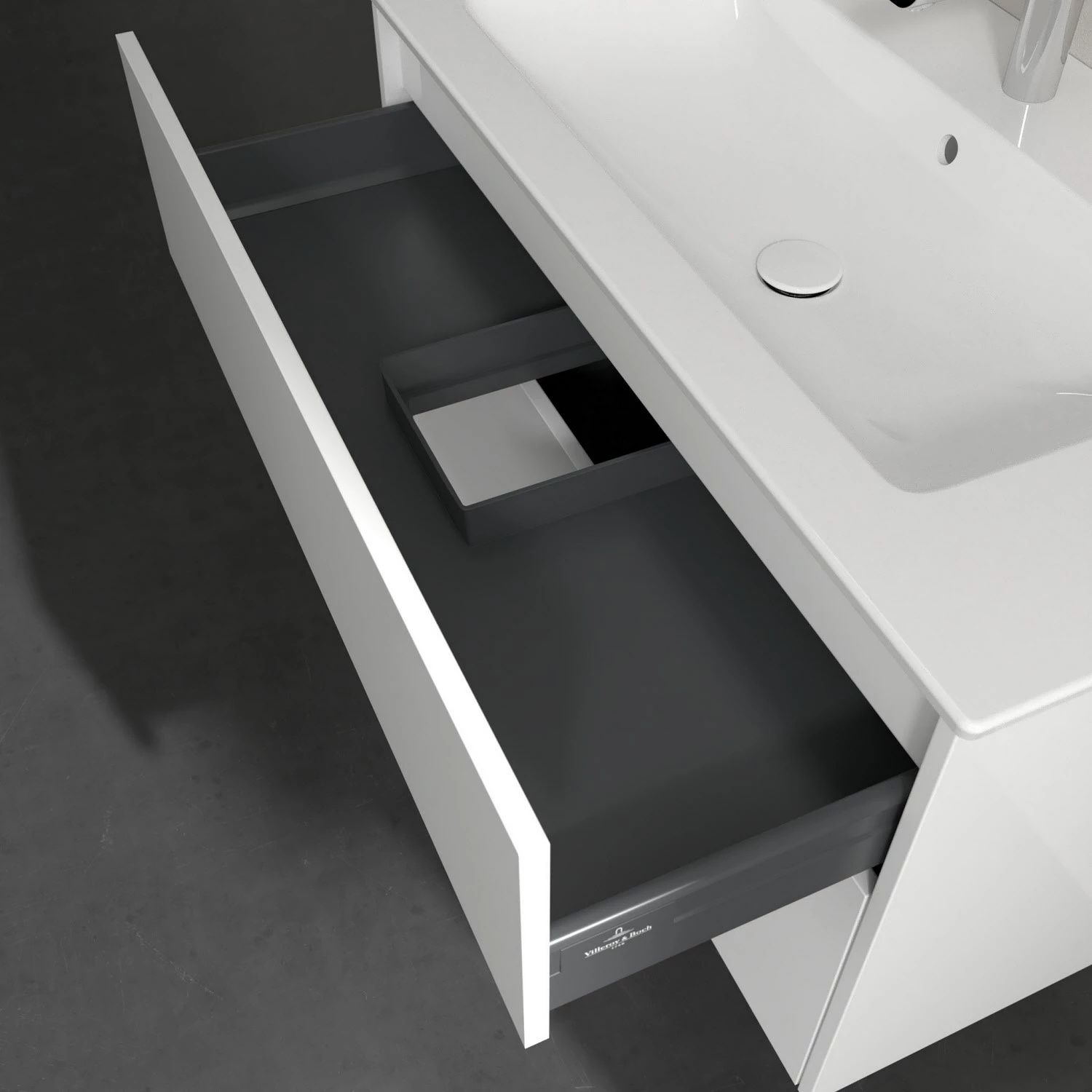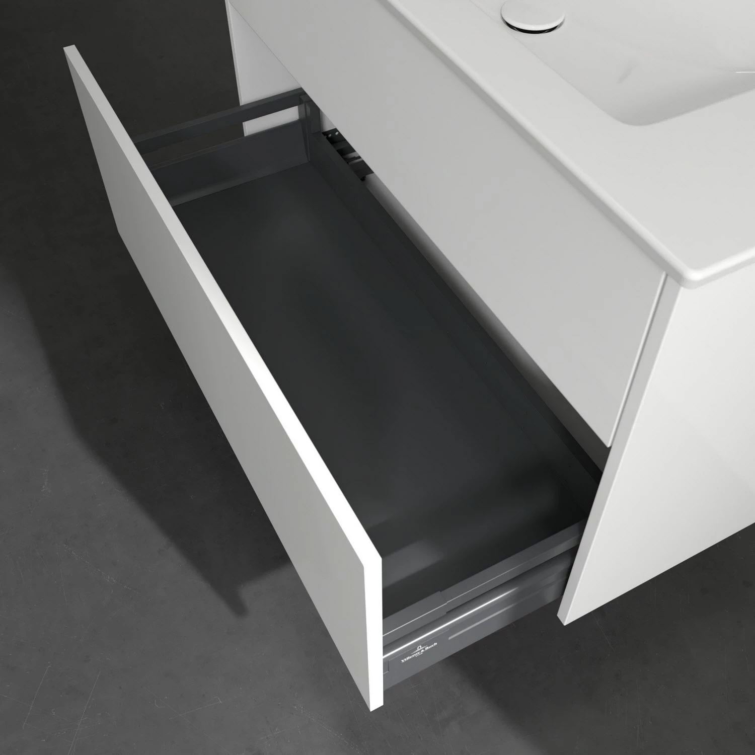 Stilsicher fügt sich der Finero Waschtischunterschrank von Villeroy & Boch mit seinem modernen, klaren Design in jedes Badezimmer ein. Seine beiden Auszüge verfügen über viel Platz für beispielsweise Handtücher, Föhn oder Pflegeprodukte aller Art. Durch die unterschiedliche Höhe eignet sich der obere Auszug besonders für kleinere, handlichere Gegenstände und im unteren können auch sperrigere Accessoires verstaut werden. Integriertem Antirutsch-Boden sei dank, bleiben diese auch am gewünschten Platz. Öffnen lassen sich die Auszüge bequem mit der innovativen Push-to-Open-Technologie – ein leichter Fingerdruck reicht aus . Geschmeidig sanft und leise gleiten sie anschließend über Selbsteinzug wieder zu.