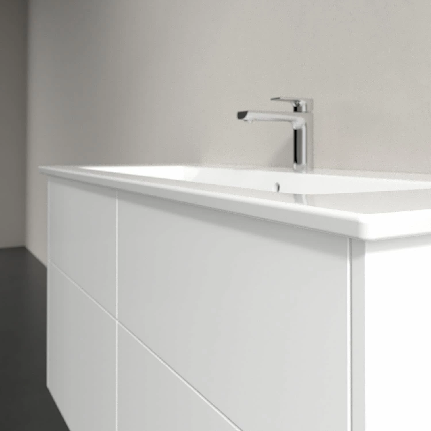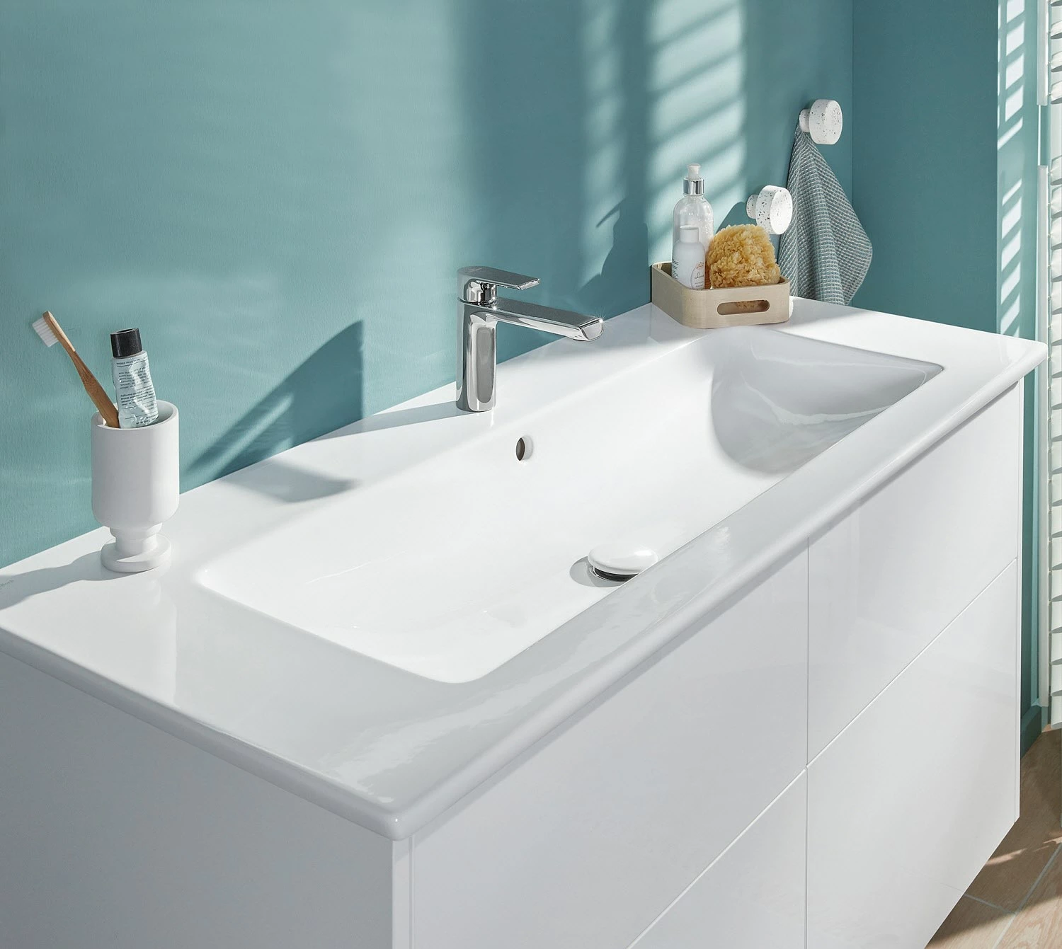 Der rechteckige Finero Waschtisch präsentiert sich besonders filigran und leicht mit seinen dünnen Kanten. Das großzügig gestaltete Becken erweist sich dank seiner Tiefe als besonders komfortabel bei der täglichen Badroutine – sei es beim Zähneputzen, Hände- oder gar beim Haarewaschen. Dabei verfügt es über seitliche Ablageflächen und eine breite Hahnlochbank für die wichtigsten Badaccessoires wie Seife oder Zahnputzbecher. Die hochwertige Sanitärkeramik von Villeroy & Boch ist besonders robust und pflegeleicht . Dank der schmutzabweisenden Oberfläche geht die Reinigung schnell und einfach von der Hand.