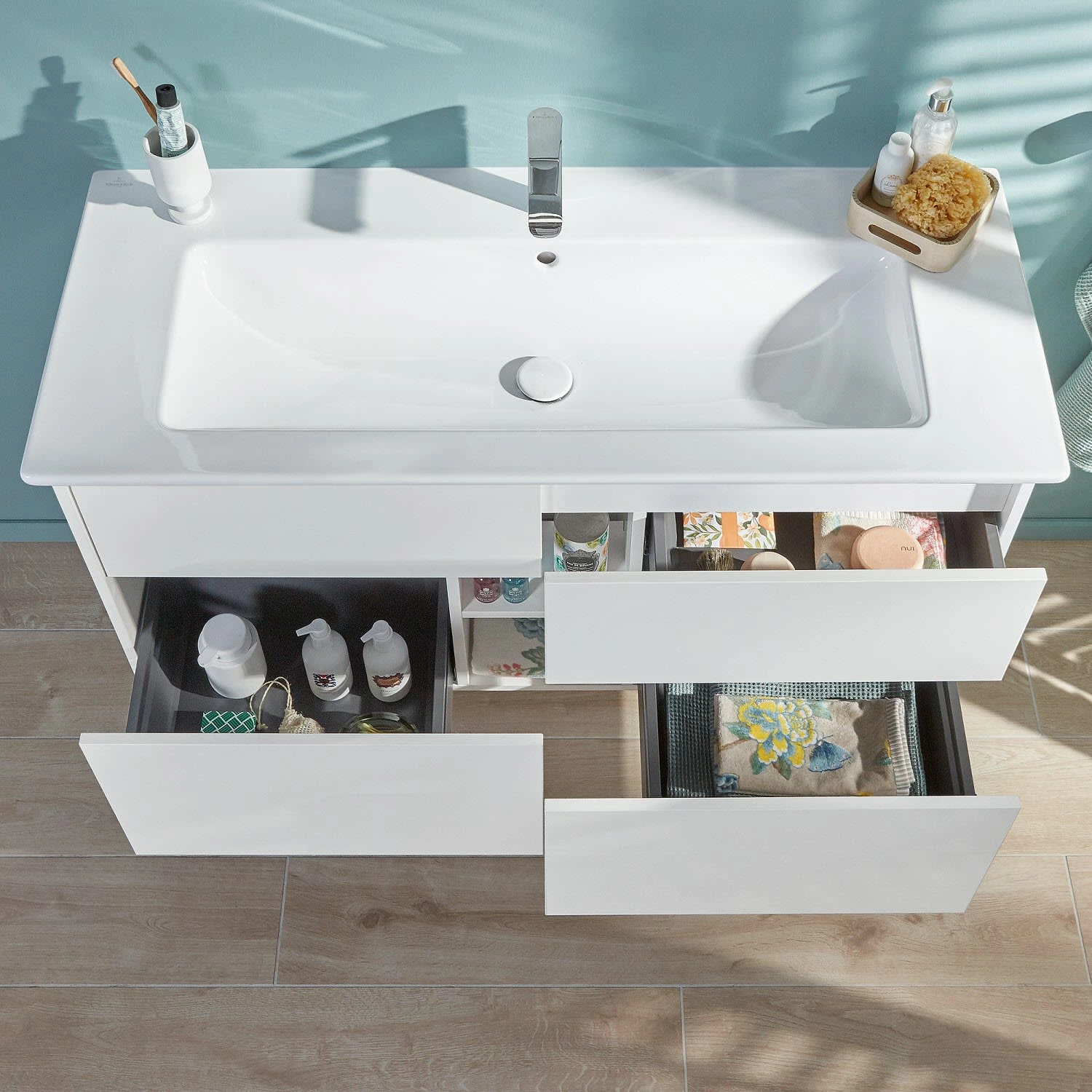 Stilsicher fügt sich der Finero Waschtischunterschrank von Villeroy & Boch mit seinem modernen, klaren Design in jedes Badezimmer ein. Seine vier Auszüge verfügen über viel Platz für beispielsweise Handtücher, Föhn oder Pflegeprodukte aller Art. Durch die unterschiedliche Höhe eignet sich der obere Auszug besonders für kleinere, handlichere Gegenstände und im unteren können auch sperrigere Accessoires verstaut werden. Integriertem Antirutsch-Boden sei dank, bleiben diese auch am gewünschten Platz. Öffnen lassen sich die Auszüge bequem mit der innovativen Push-to-Open-Technologie – ein leichter Fingerdruck reicht aus . Geschmeidig sanft und leise gleiten sie anschließend über Selbsteinzug wieder zu.