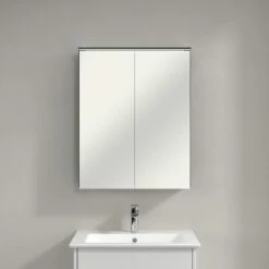 Harmonische Ergänzung zum Möbel-Set und praktisches Stauraumwunder: der Finero Spiegelschrank von Villeroy & Boch. Optisch überzeugt er mit seinem Aluminium-Korpus und einer Aufsatzleuchte , die sich über die gesamte Spiegelfläche streckt. Sie sorgt für eine hervorragende Ausleuchtung beim Schminken oder Frisieren. Bedient wird das Licht über den innenliegenden Lichtschalter, der auch einen Wechsel von Warmweiß zu Kaltweiß ermöglicht . Auf den schicken, verstellbaren Glaseinlegeböden gibt es genügend Platz für Kosmetikartikel, elektrische Zahnbürste oder Haarbürsten. Praktisch sind außerdem die innenliegende Steckdose zum Laden elektronischer Geräte und Zubehör wie Vergrößerungsspiegel und Magnetleiste für Pinzette oder Nagelschere. Öffnen lässt sich der Spiegelschrank komfortabel über die nach unten leicht überstehenden, beidseitig verspiegelten Türen. Alternativ können zusätzlich auch die beiliegenden Spiegelgriffe in Chrom angebracht werden.