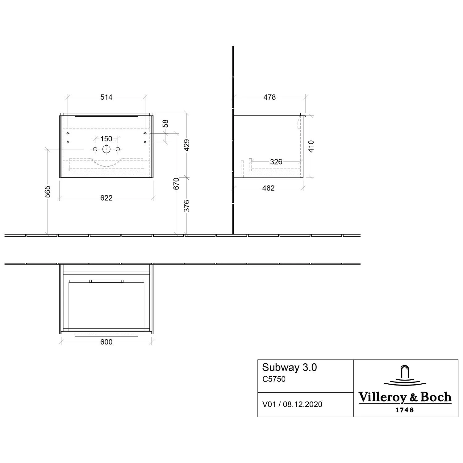 Villeroy & Boch Subway 3.0 Badmöbel-Set 65 cm, Griff volcano black, 1 Auszug