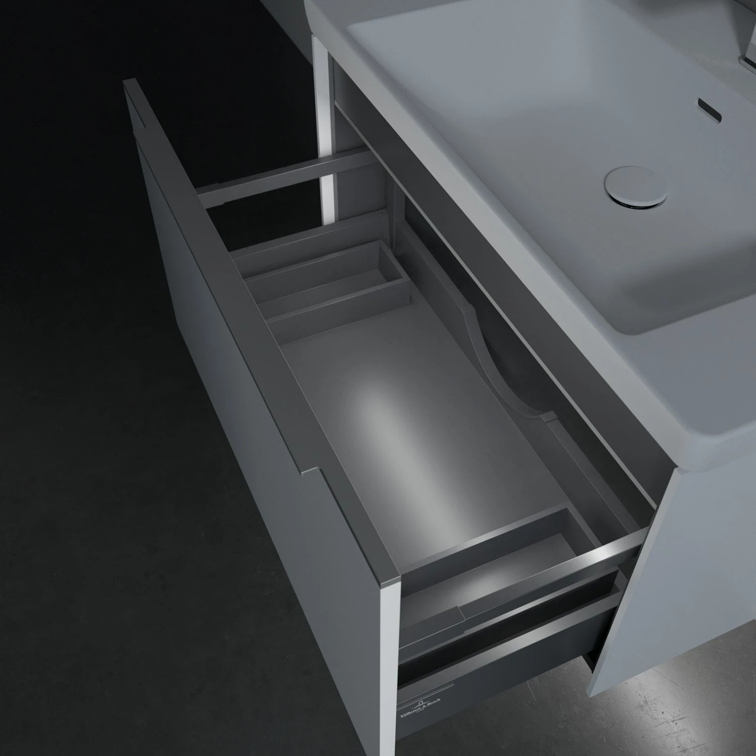 Der Waschtischunterschrank besticht durch gradliniges, zeitloses Design und großzügigen Stauraum. Eine voll ausziehbare Schublade mit rutschhemmendem Boden, Selbsteinzug-Funktion sowie zwei integrierten kleinen Accessory-Boxen bietet Platz für Pflege- und Hygieneartikel. Front und Korpus sind hochwertig verarbeitet. Die dezente Griffleiste sorgt für einfache Handhabung und bildet einen besonderen Design-Akzent.